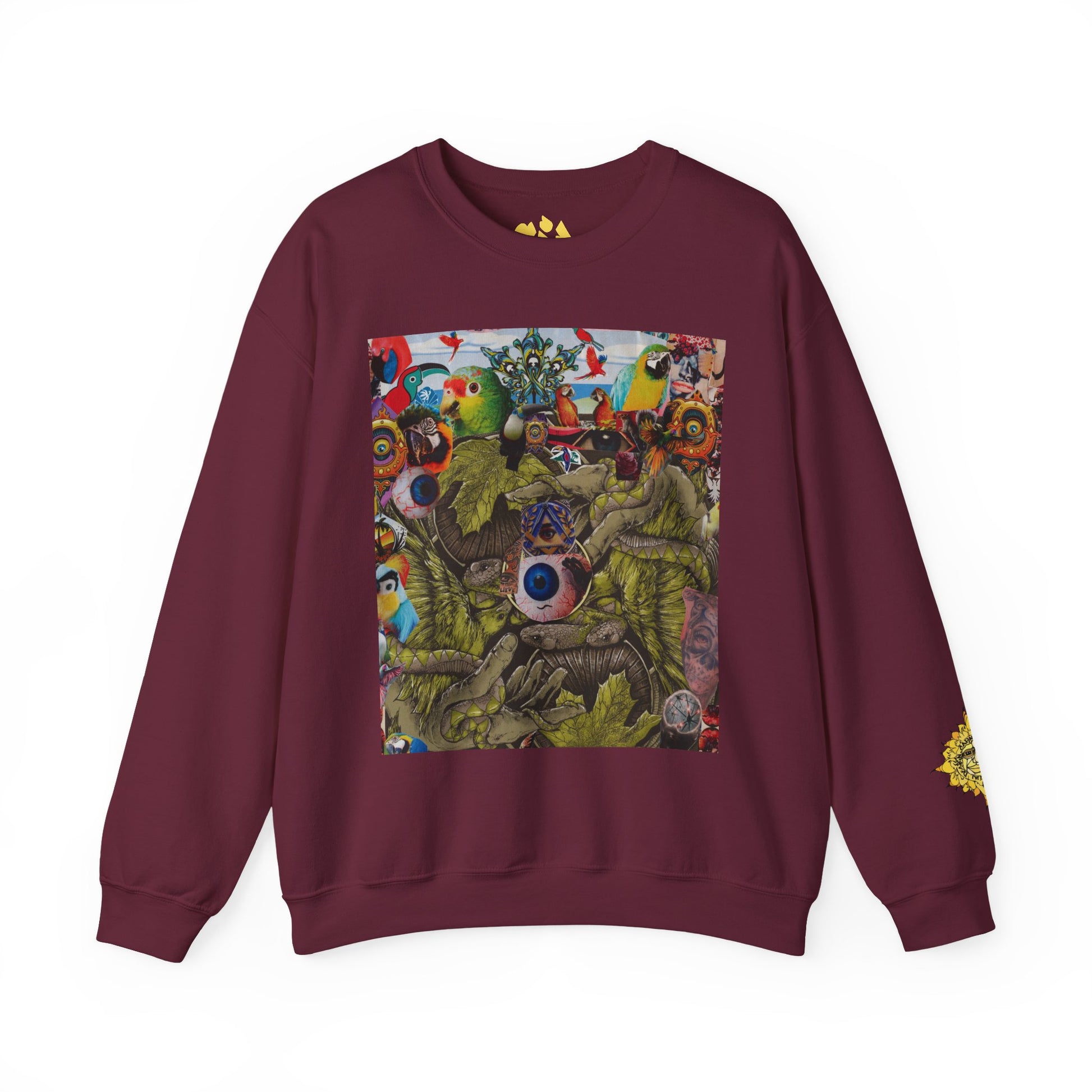 Apoda Surreal Parrot Garden Collage Sweatshirt — Psychedelic Bird Collage Crewneck