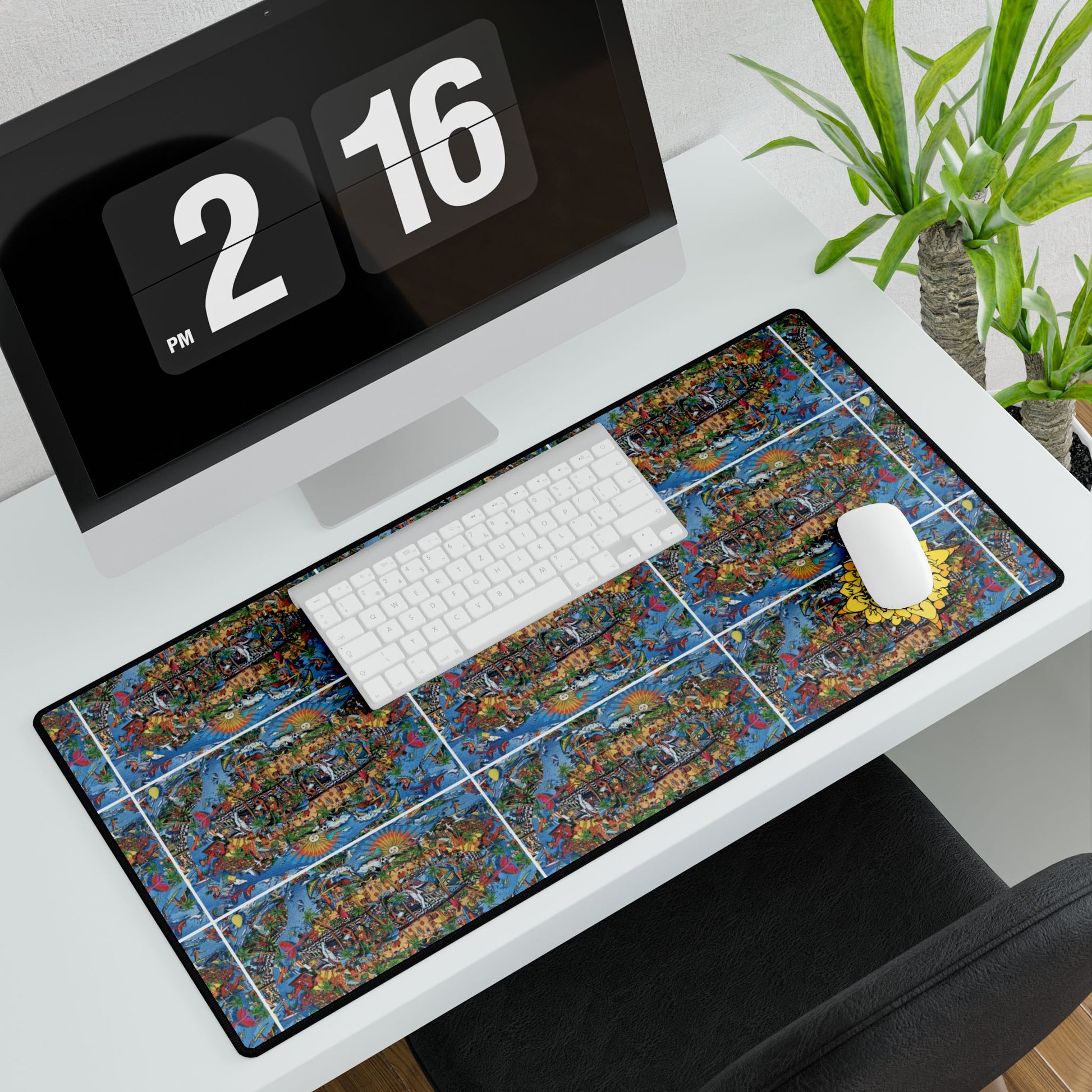 Florida Collage Artwork Boho Mosaic Desk Mat — Floral Sun Accent Large Mousepad