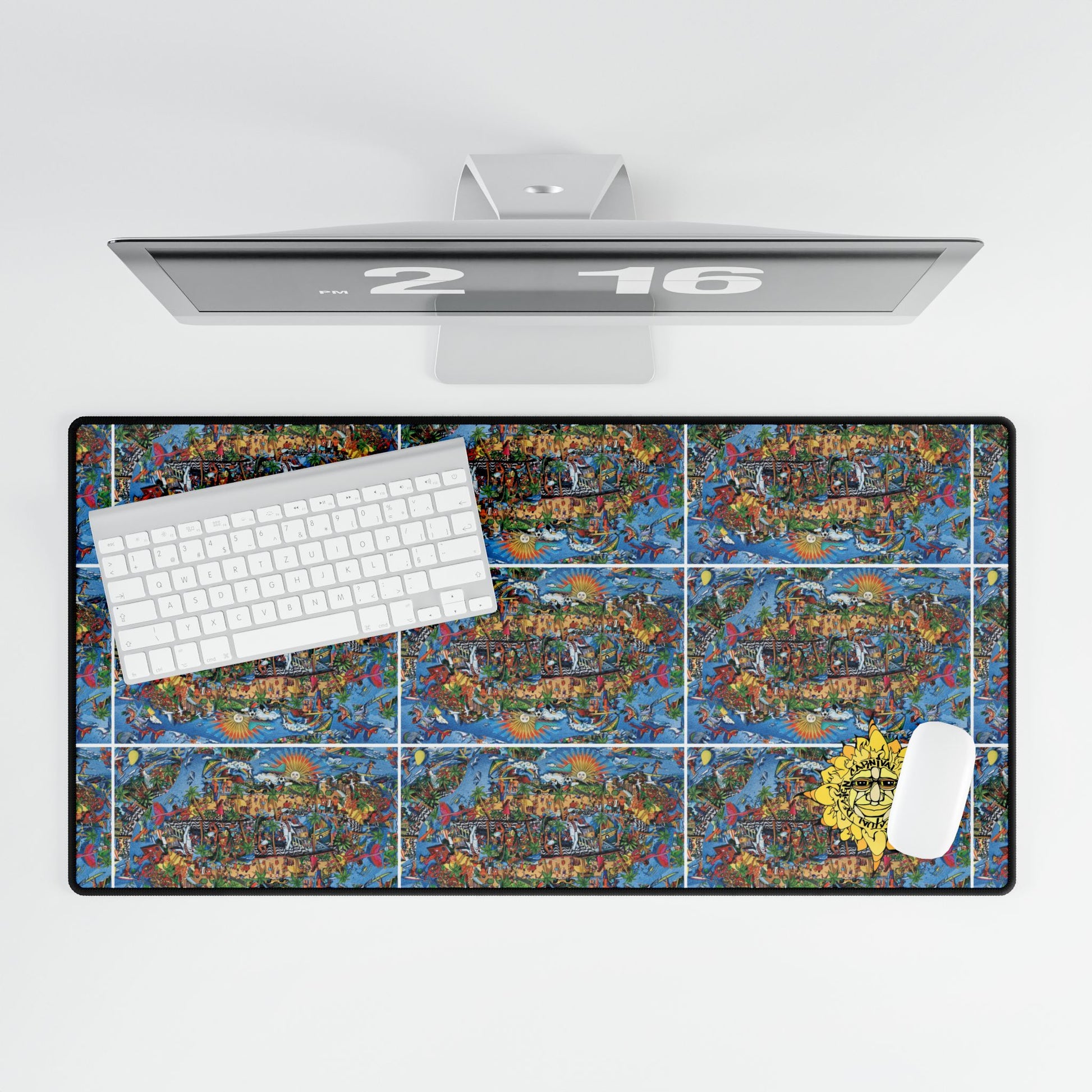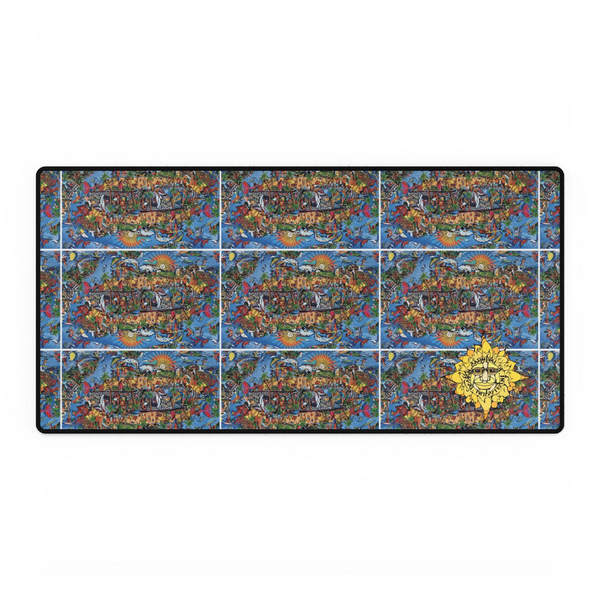 Spread color and character across your workspace with this oversized desk mat. A rich, repeating collage of abstract patterns brings energy to long work or play sessions, while a hand-drawn sun emblem in the corner adds a warm, whimsical touch. The low-profile, smooth surface lets your mouse glide without interruption and the sturdy rubber base keeps everything anchored during focused bursts. Choose a size that fits your setup — from compact desks to extended gaming rigs — and let this mat become the backdrop for creativity, late-night workflows, and everyday rituals.