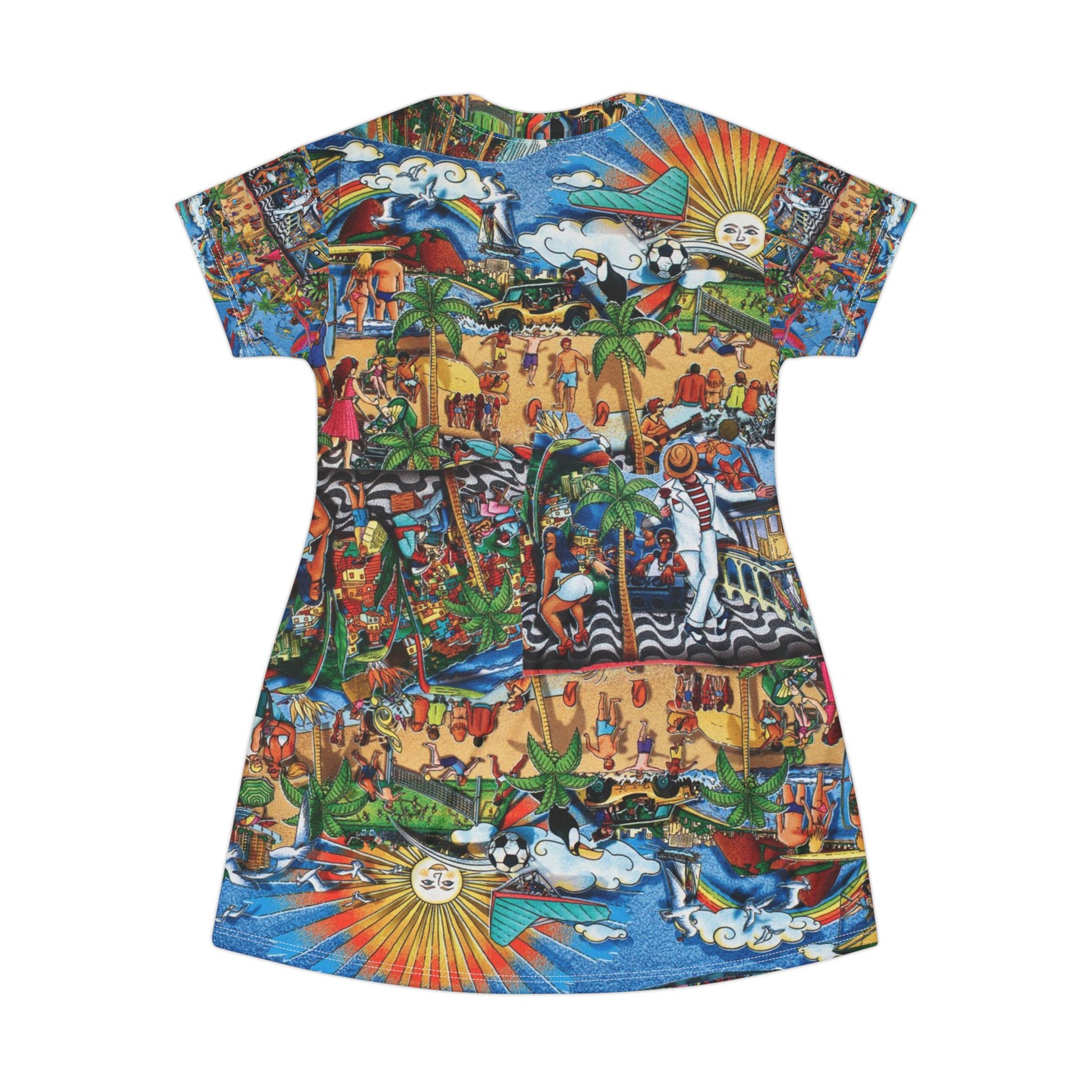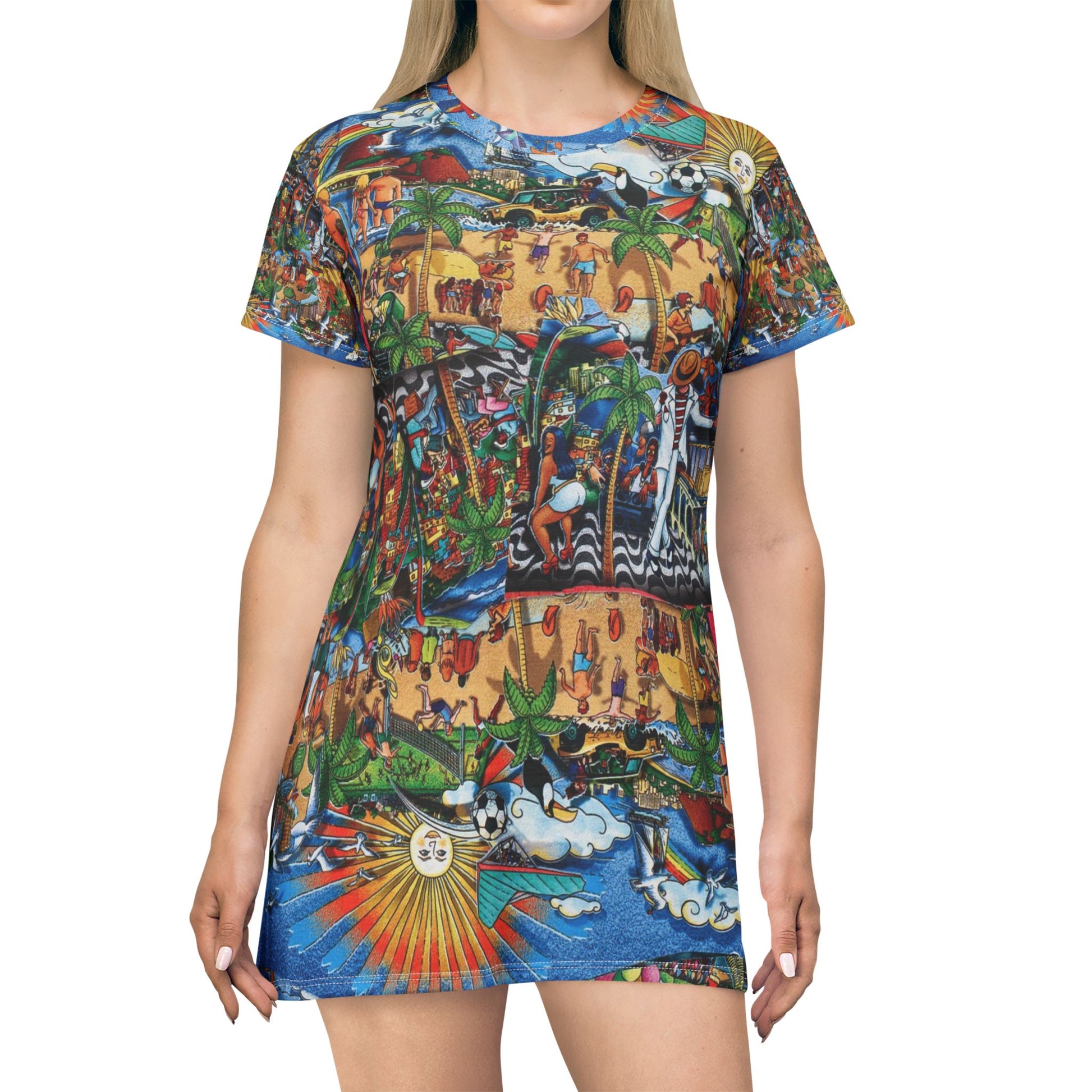 This lightweight dress is a living collage—bright, kinetic, and made to move. The all-over print wraps vivid geometric bursts, vintage motifs, and layered textures into one kaleidoscopic piece that reads like wearable art. It drapes softly, breathes easily, and keeps its silhouette thanks to side seams and self-fabric binding. Wear it to gallery openings, street festivals, or slow afternoons at a café when you want your outfit to start conversations. The tagless, true-to-size cut feels simple and comfortable while the polyester build keeps colors intense and details crisp through every wear.